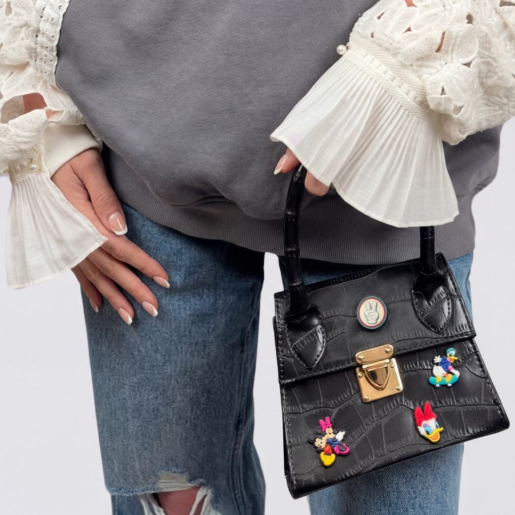 Mini sac croco avec les personnages de Disney, en simili cuir noir. Idéal pour accessoiriser une tenue classique ou décaler un look streetwear.