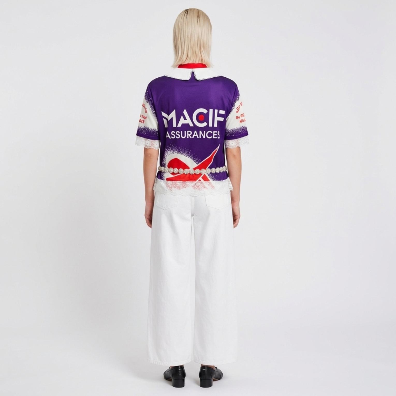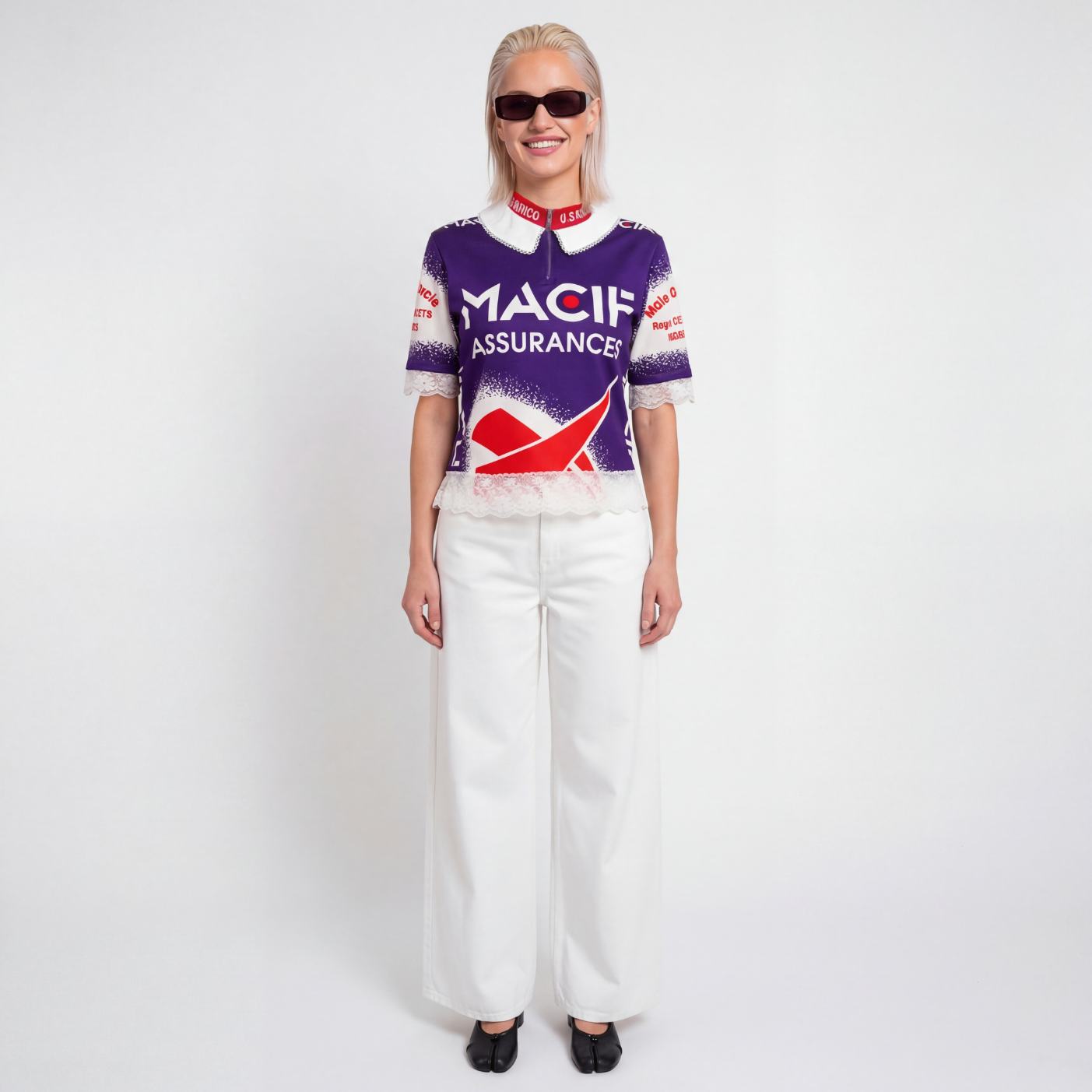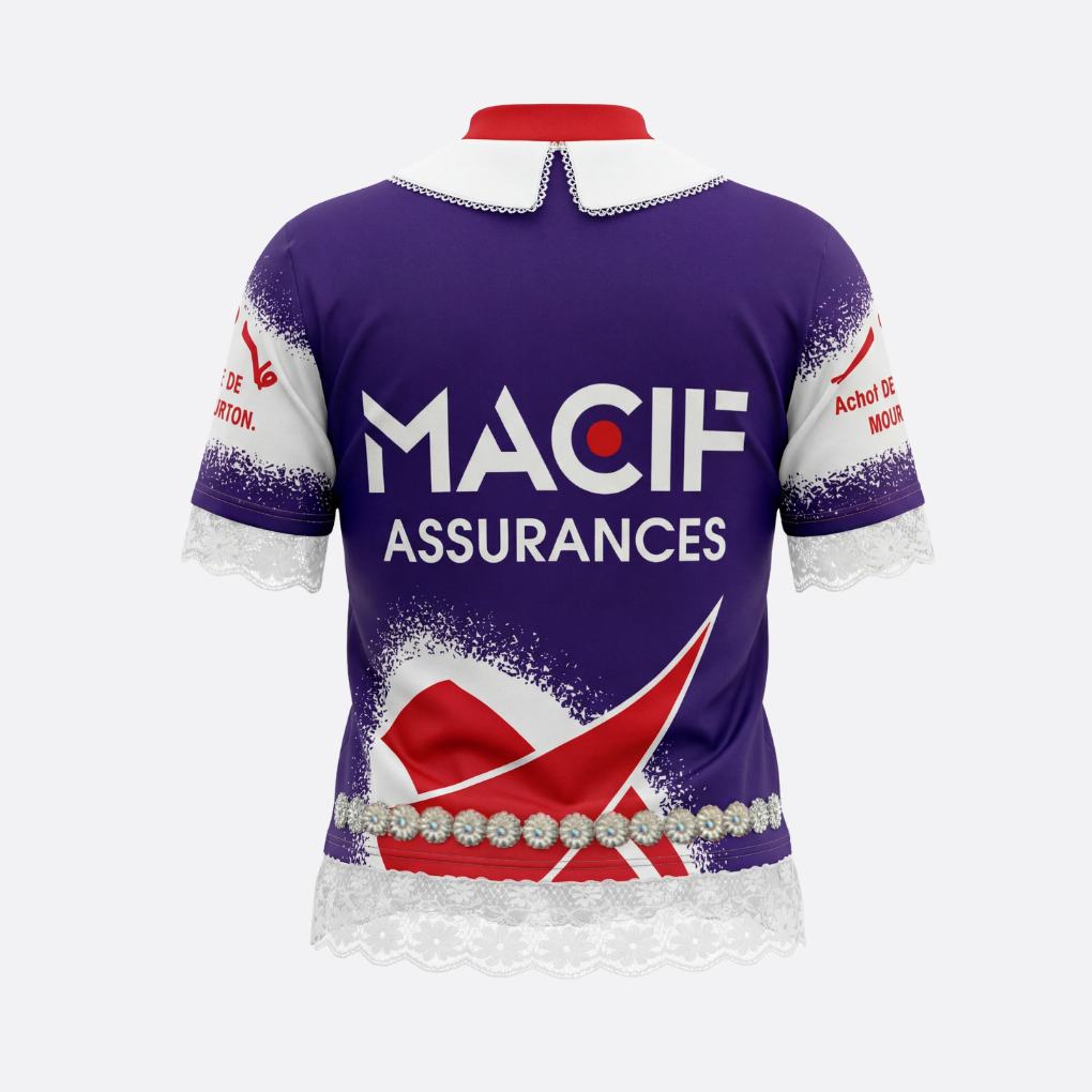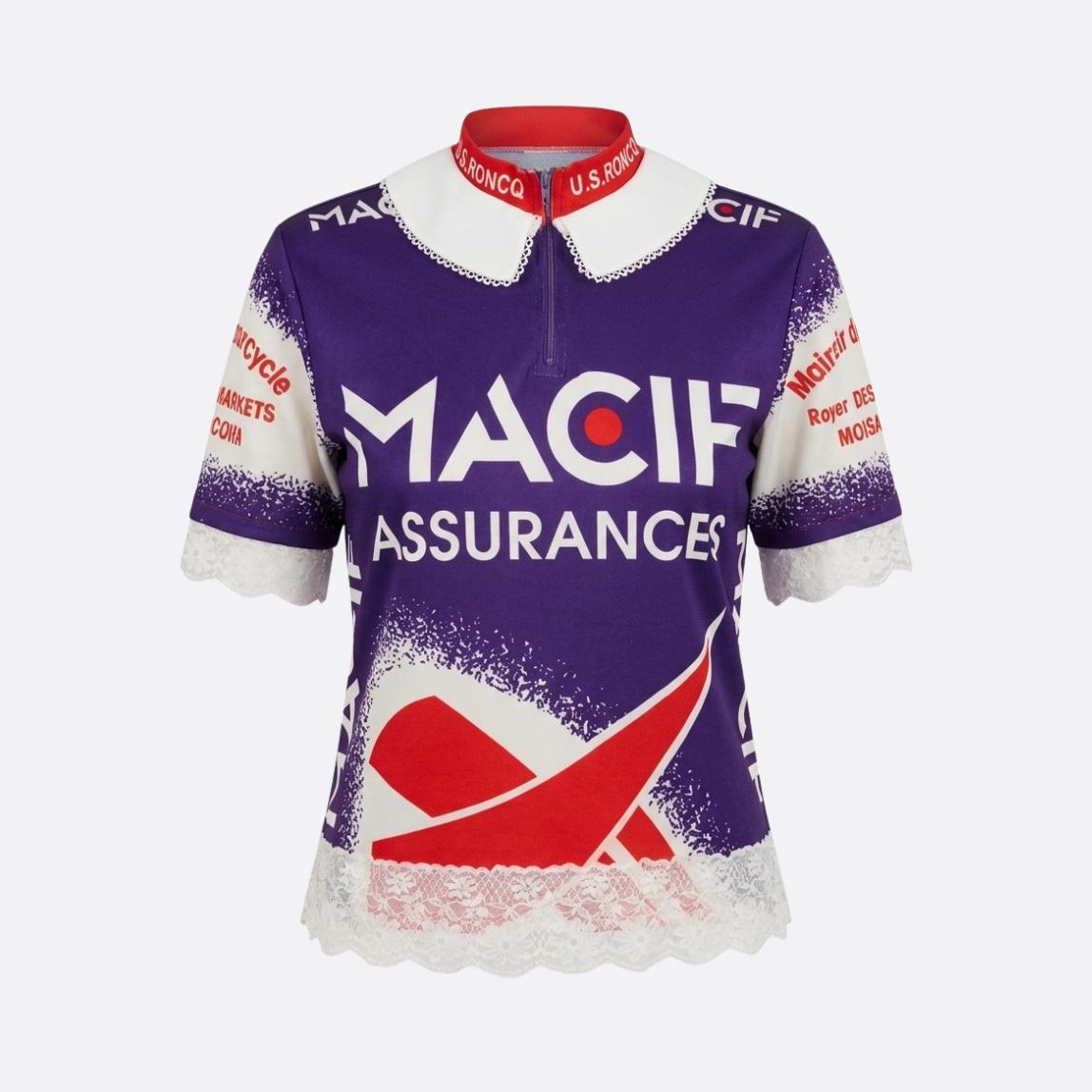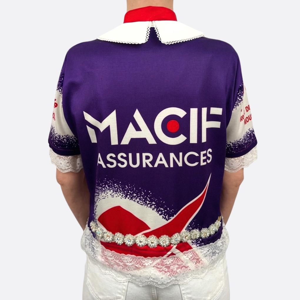 Haut cycliste Macif upcyclé avec dentelles blanches et fleurs brillantes.