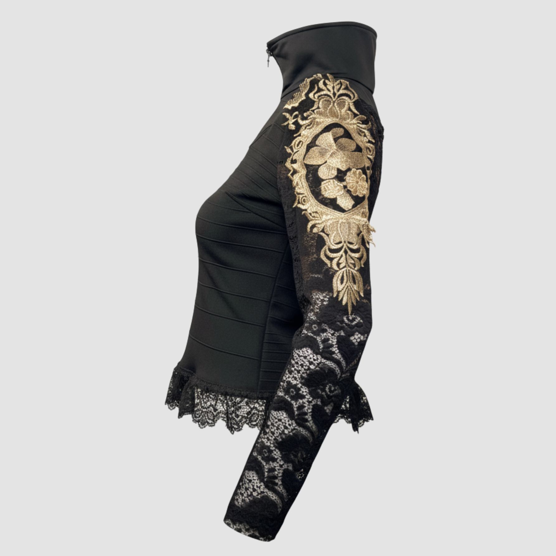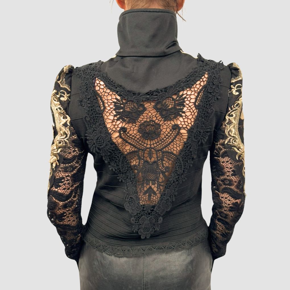 Haut dentelle 3 bandes revisité avec finitions en dentelle noire et dorée. Dos transparent en dentelle.
