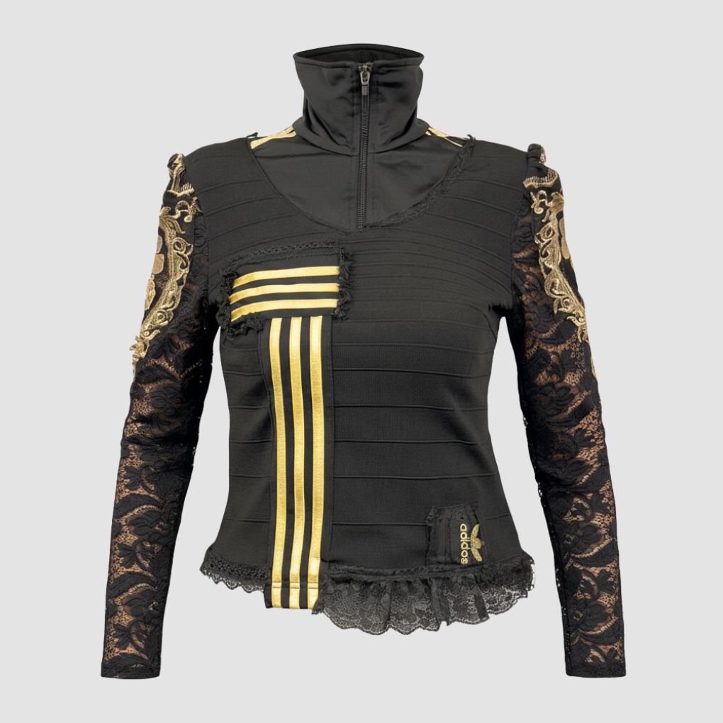 Ce top dentelle 3 bandes upcyclé convient à des personnes de taille S / M – selon si tu souhaites un look plus ou moins oversize.
