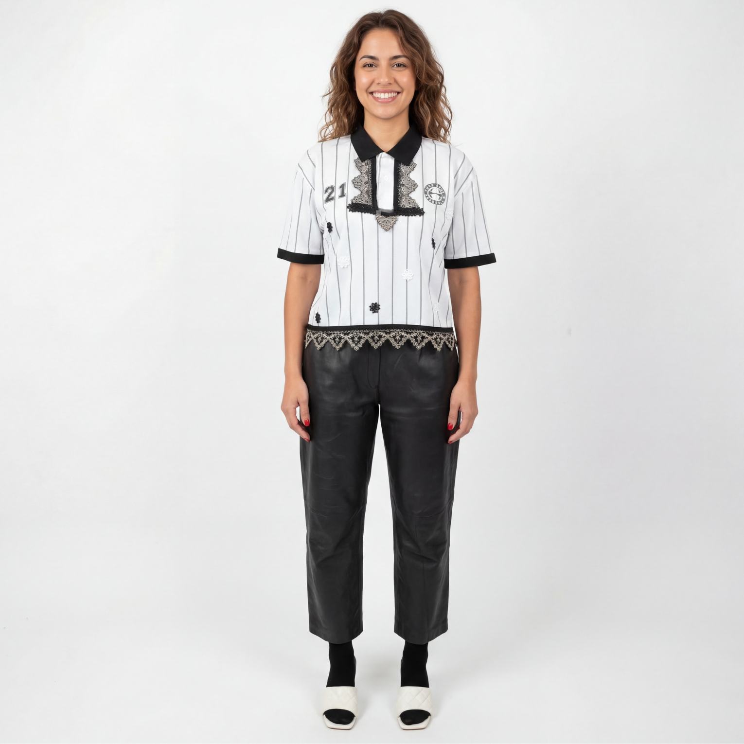 Maillot gardien de but retro reworked avec de la dentelle noire et dorée, fleurs brodées. Ce tee shirt convient à des personnes de taille S / M – selon si tu souhaites un look plus ou moins oversize.