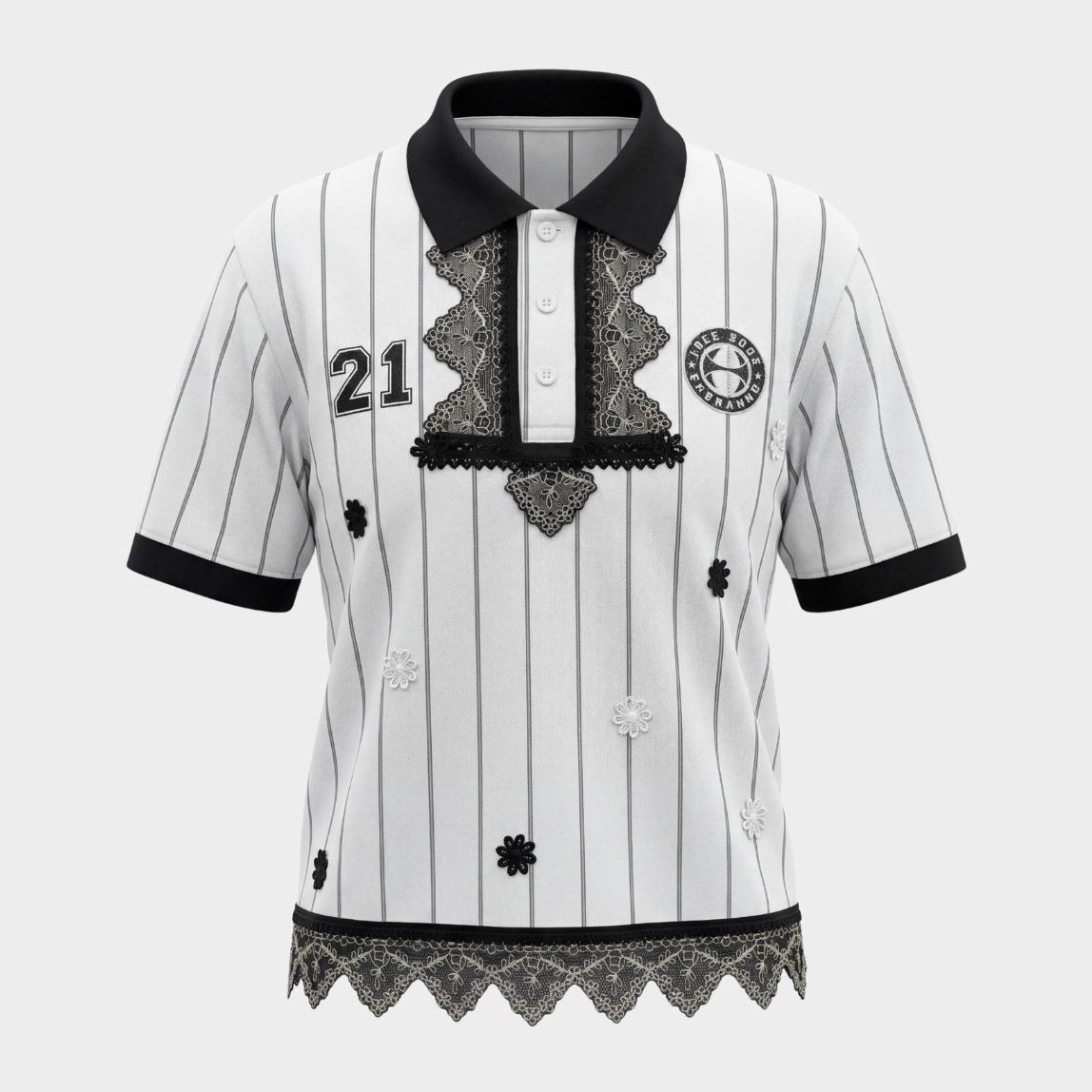 Maillot gardien de but retro rayé. Reworked avec dentelle noire et dorée, fleurs brodées.