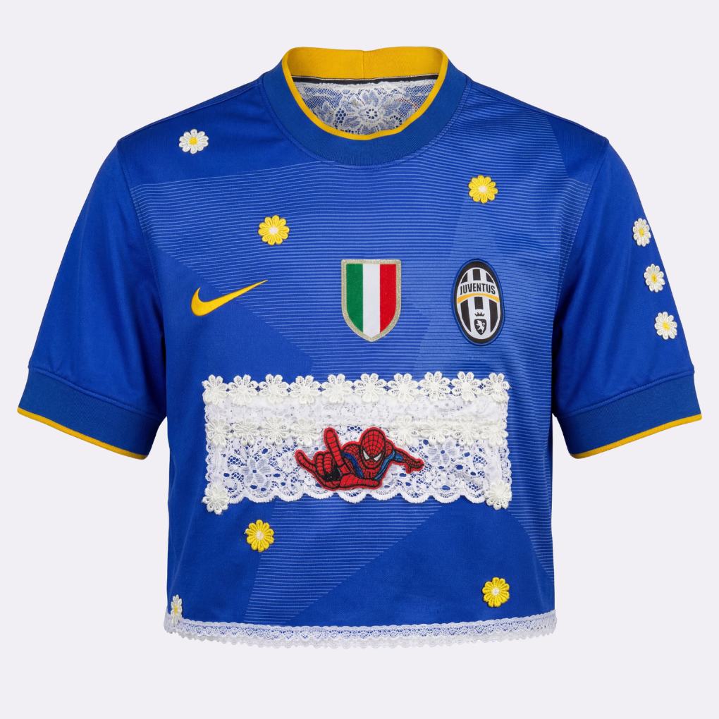 Maillot Juventus x Spider-Man upcyclé avec dentelles et fleurs.