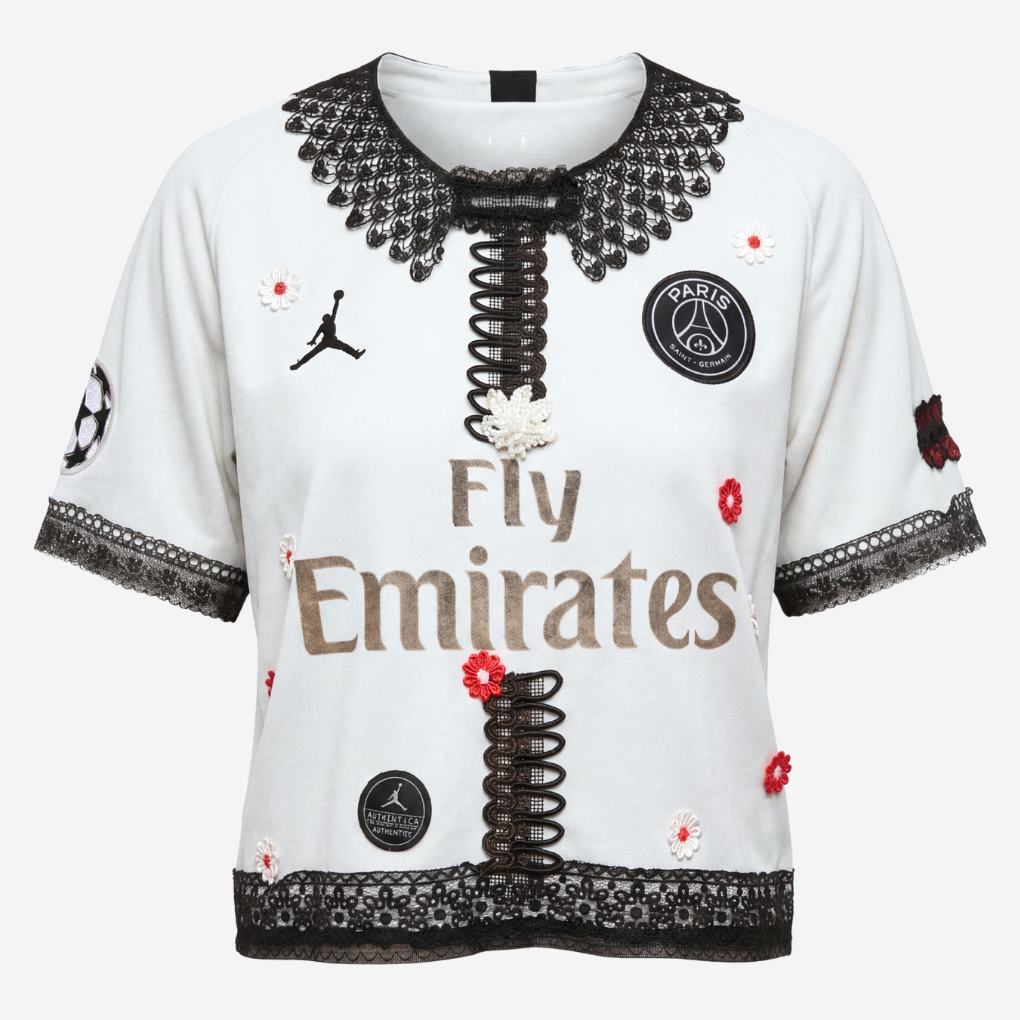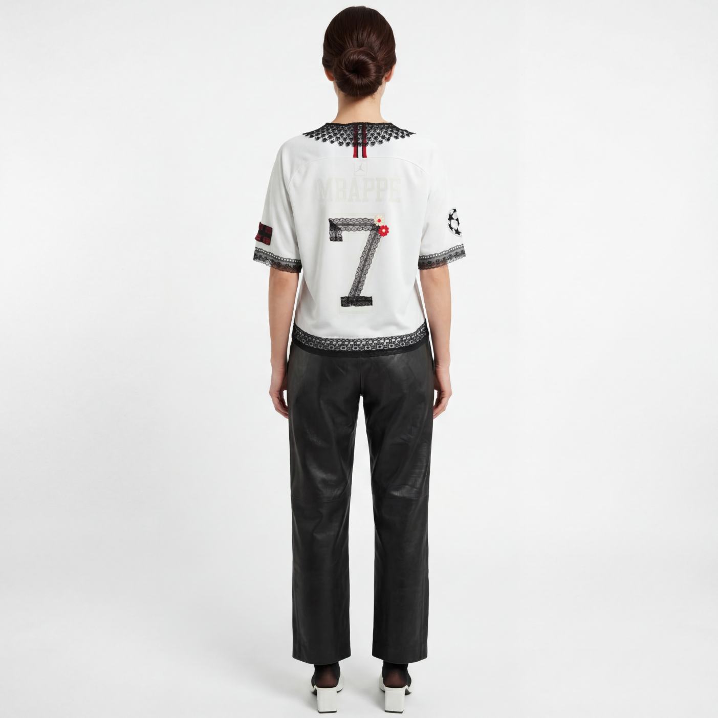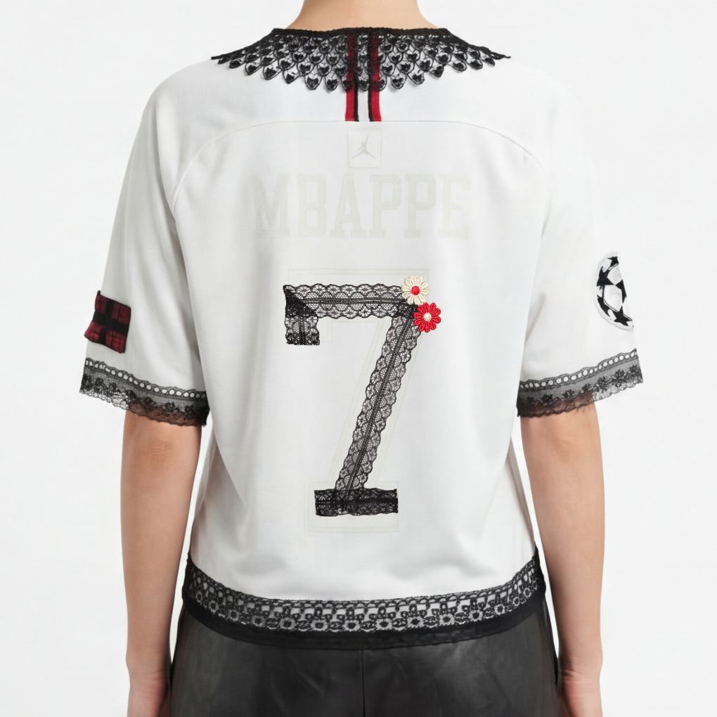 Maillot PSG vintage upcyclé avec diverses dentelles, détails et fleurs brodées. Col Claudine en crochet.