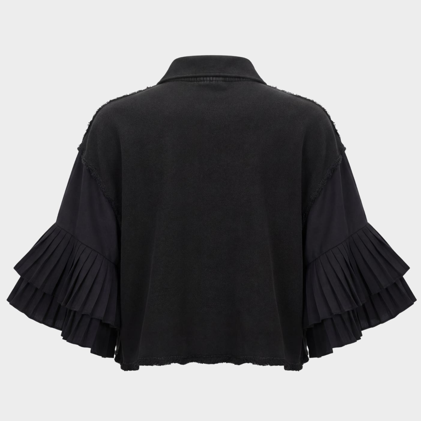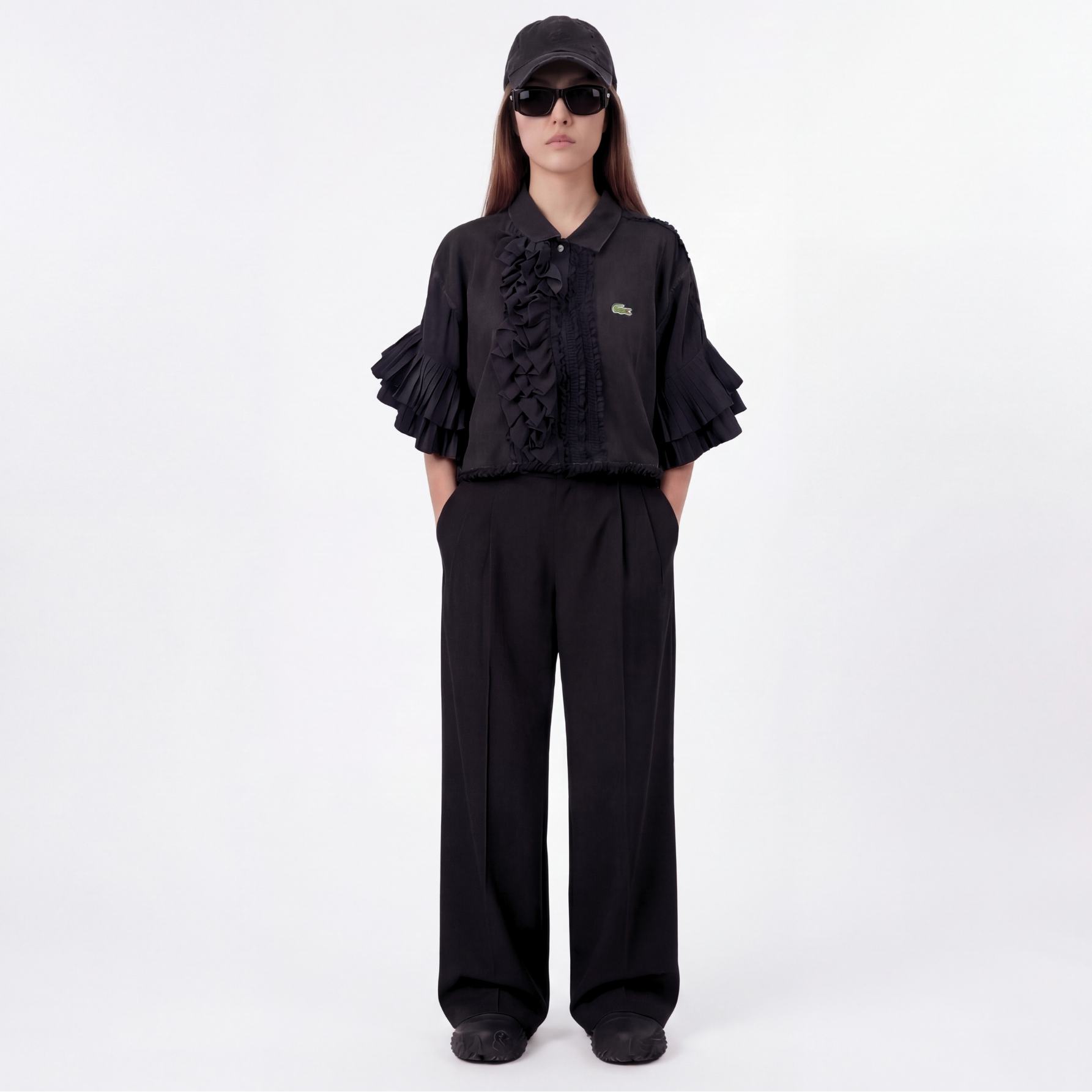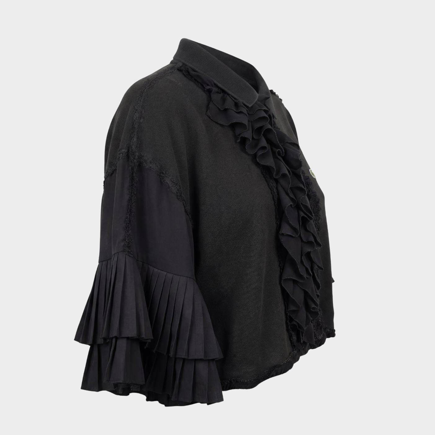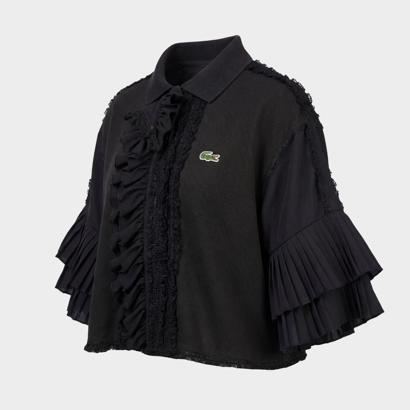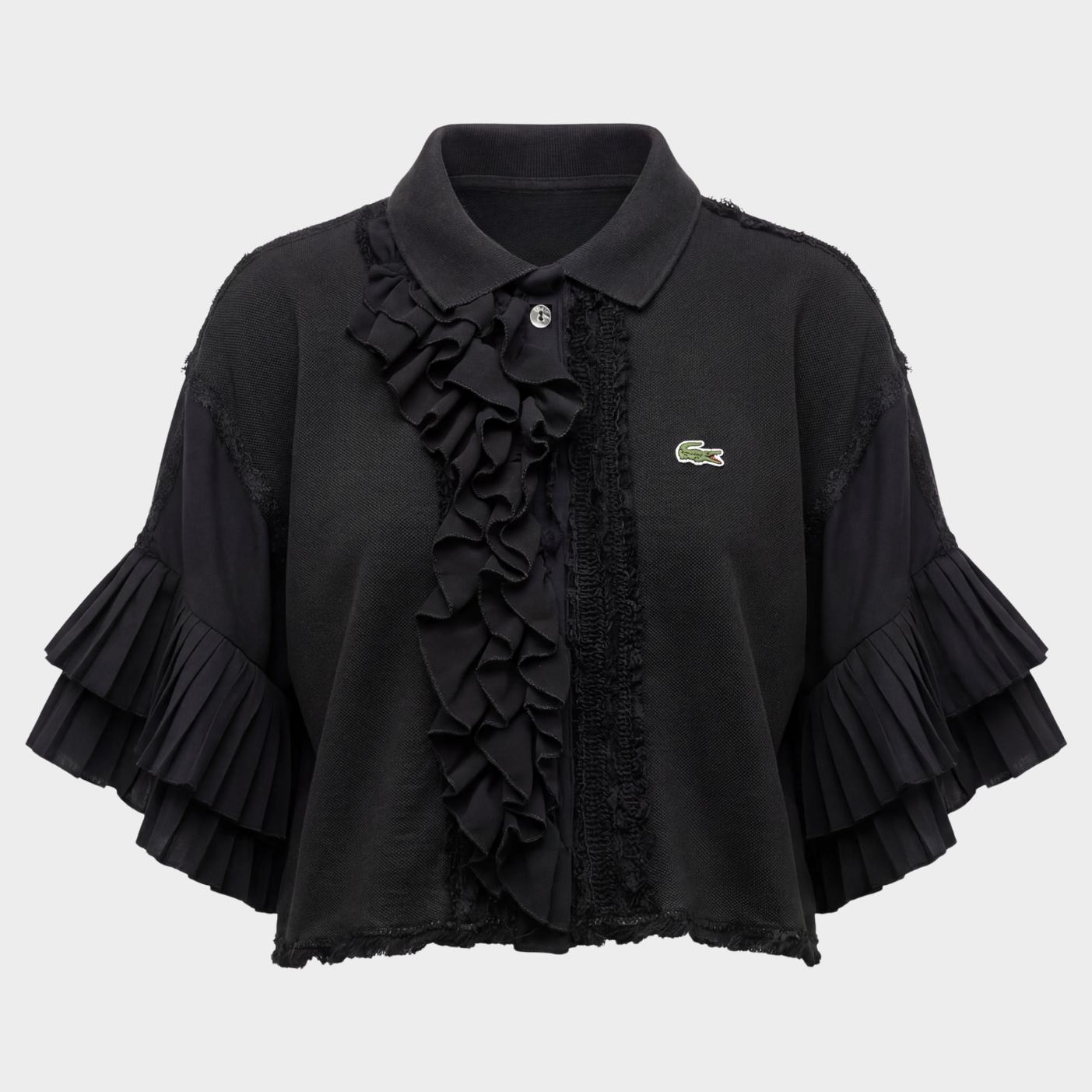 Polo Lacoste col mono-jabot destructuré vintage, fermeture avec clip. Reworked avec dentelles noires diverses et manches plissées