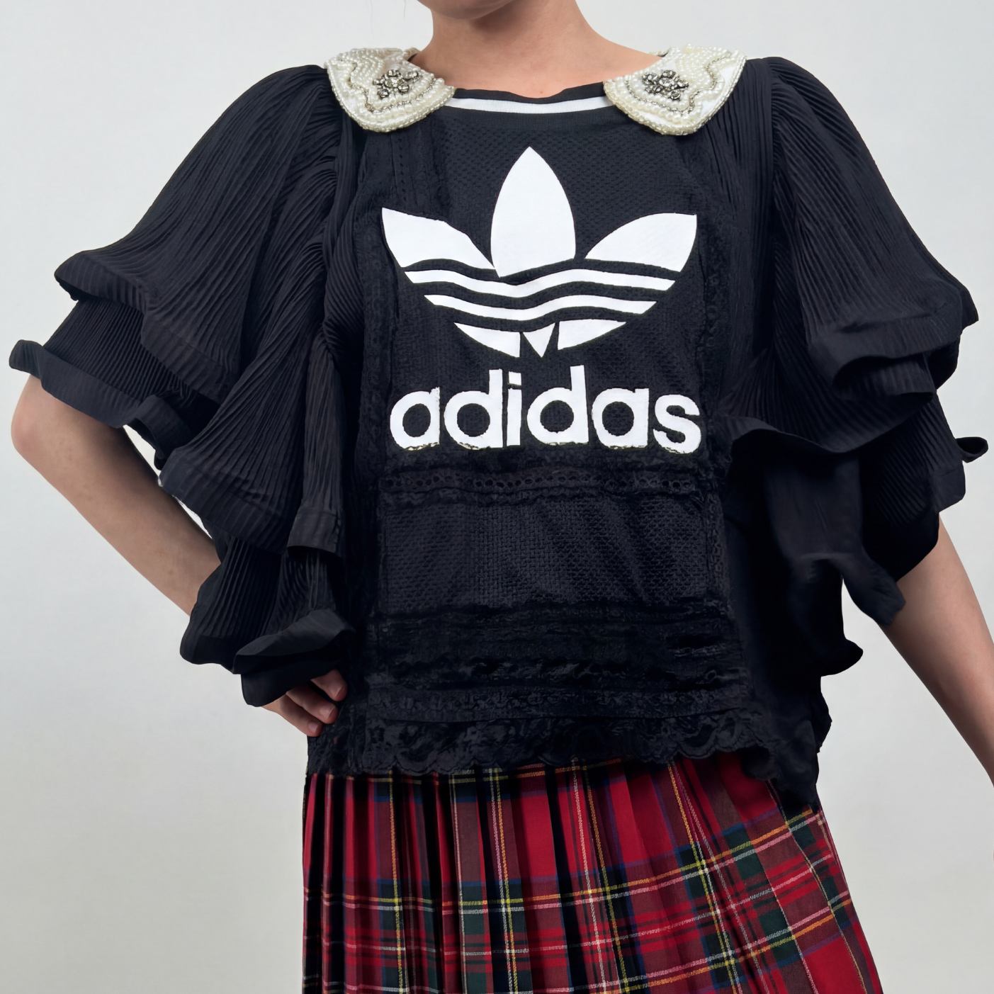 Top 3 bandes avec manches évasées plissées et volumineuses. Finitions en dentelle. Col avec perles et strass.