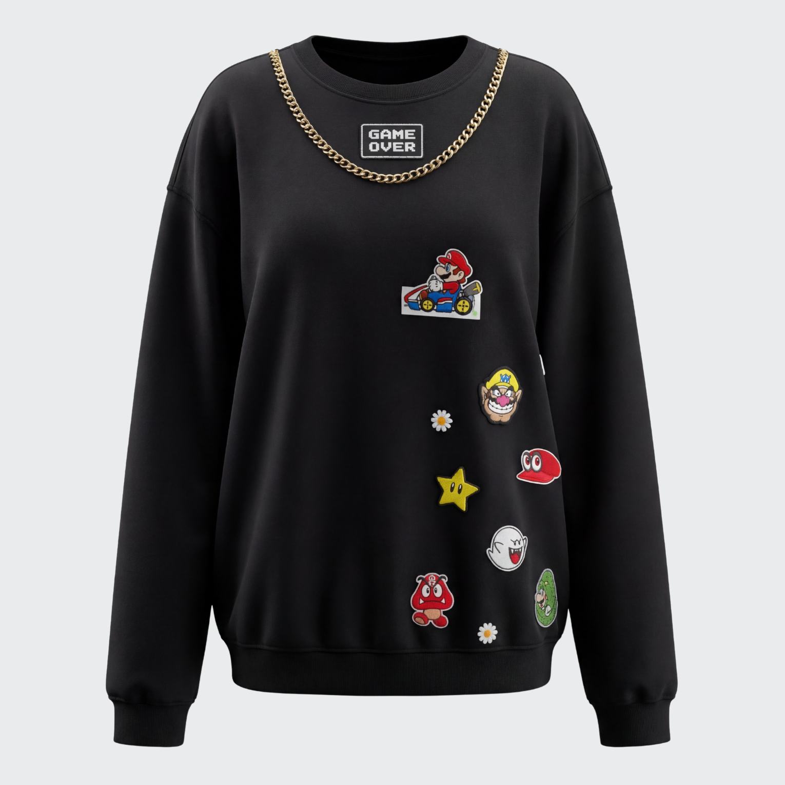Ce hoodie Mario upcyclé convient à des personnes de taille M ou L – selon si tu souhaites un look plus ou moins oversize. Les manches sont loose / longues.