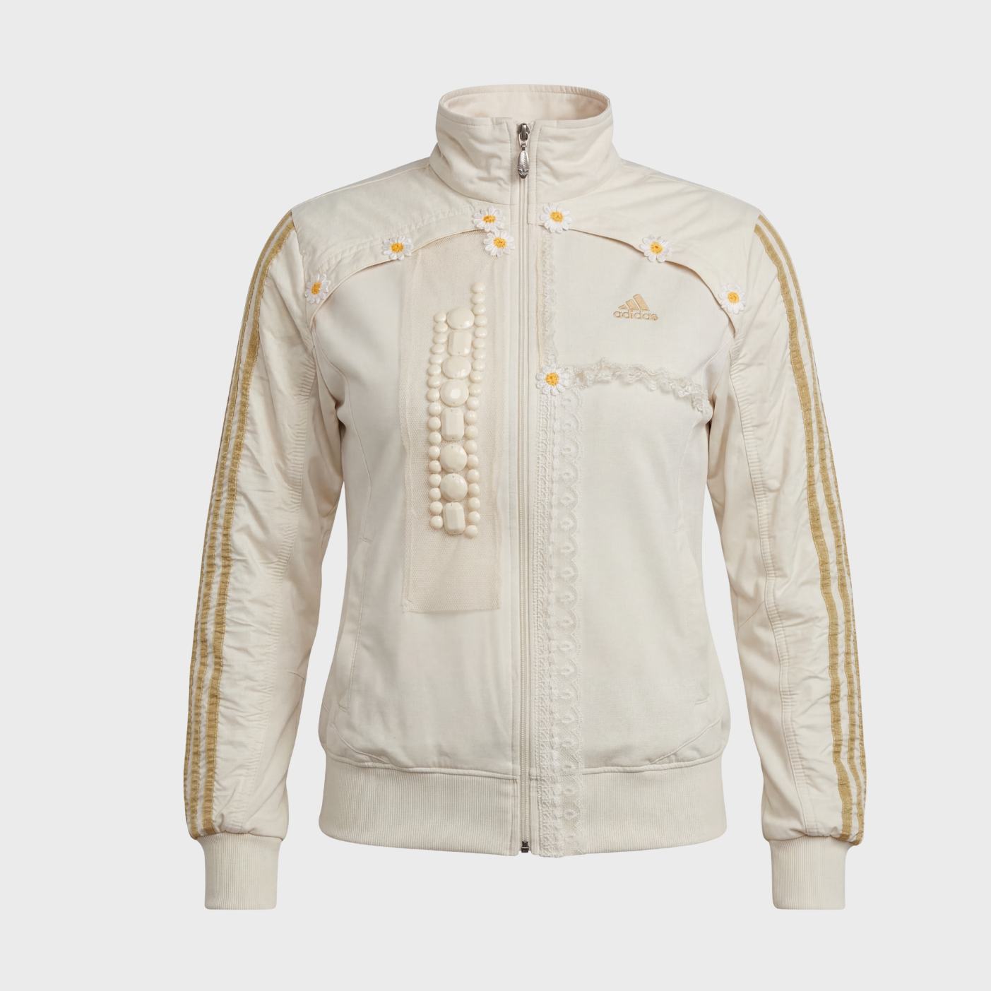 Cette veste aux 3 bandes & fleurs reworked convient à des personnes de taille S / M (selon si tu souhaites un look plus ou moins oversize).