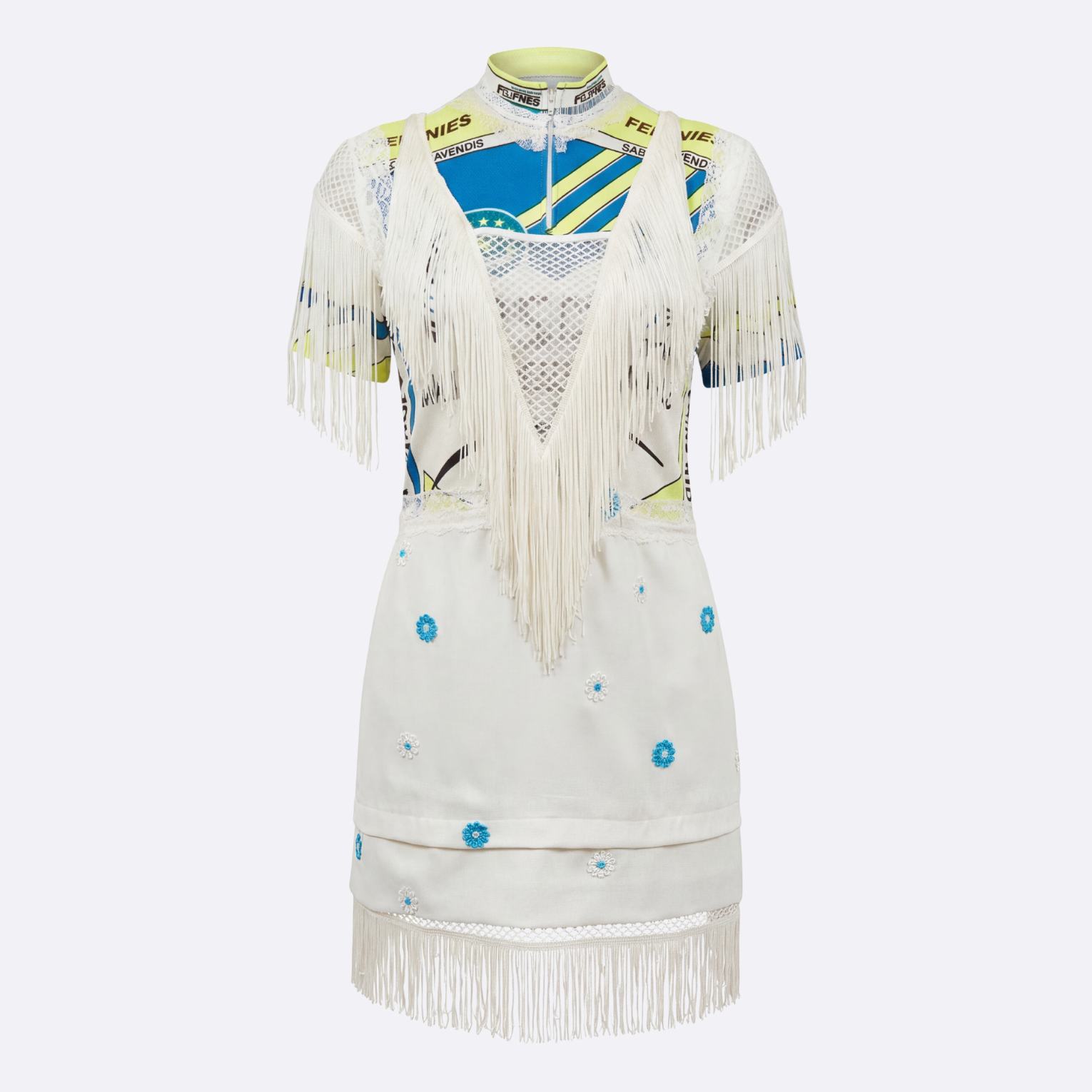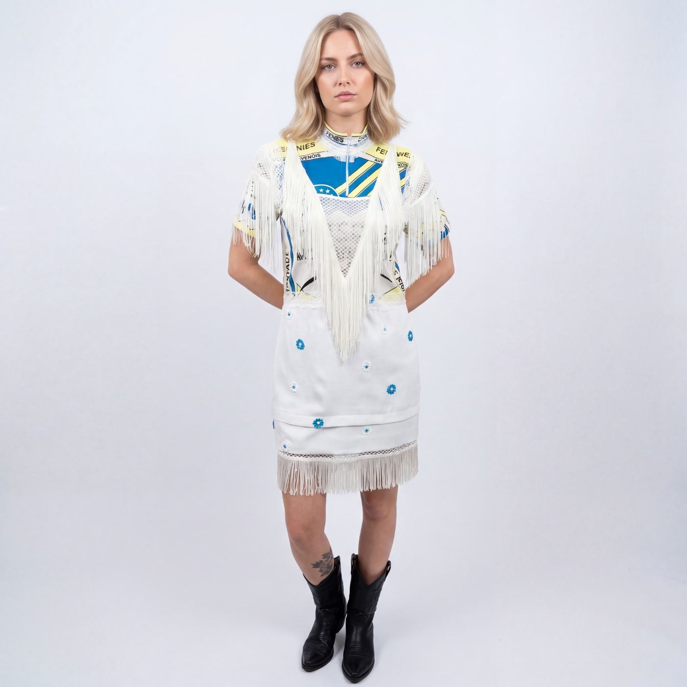 Robe cycliste western avec des fleurs blanches et turquoises brodées… mais aussi des franges, des dentelles blanches et des épaulettes incrustées.
