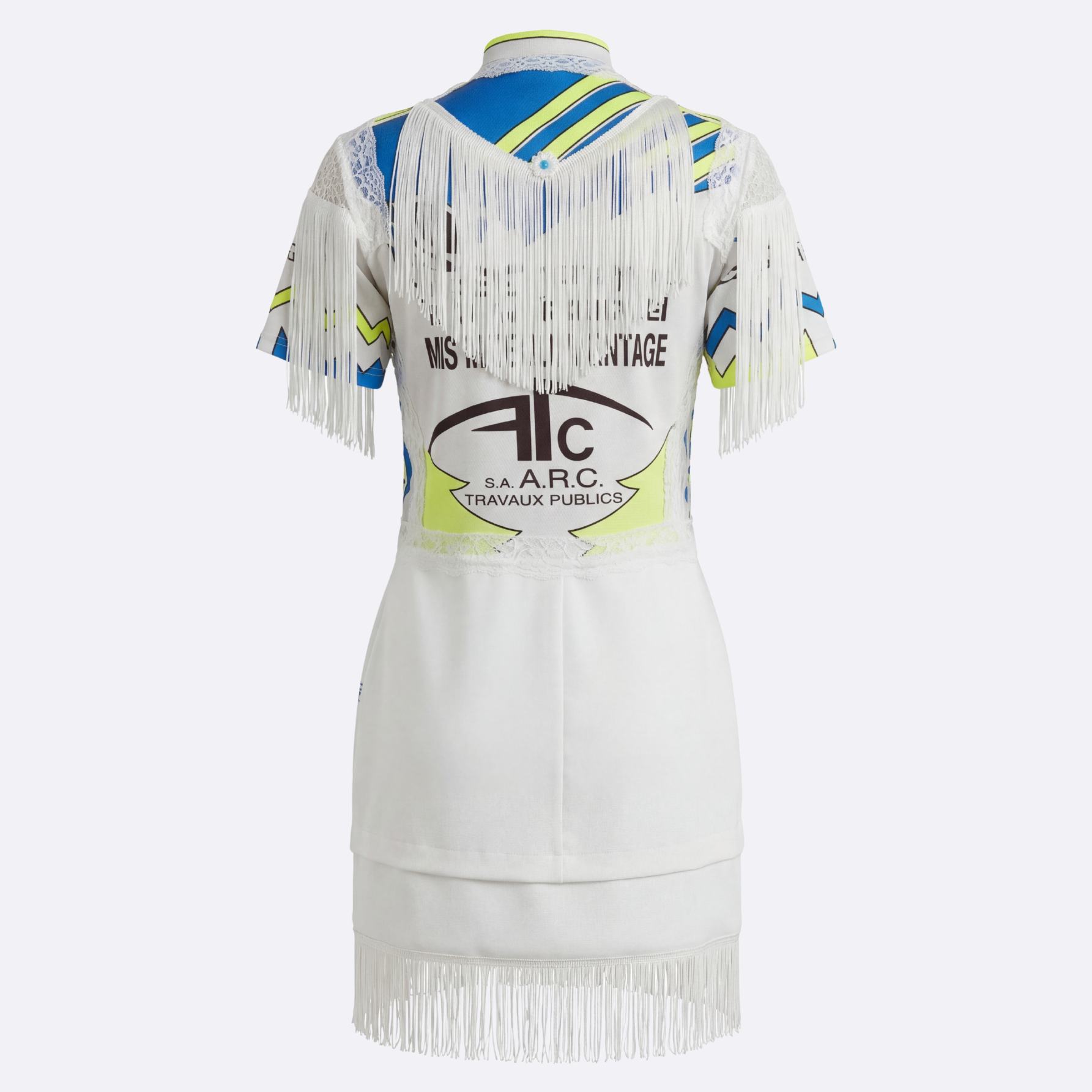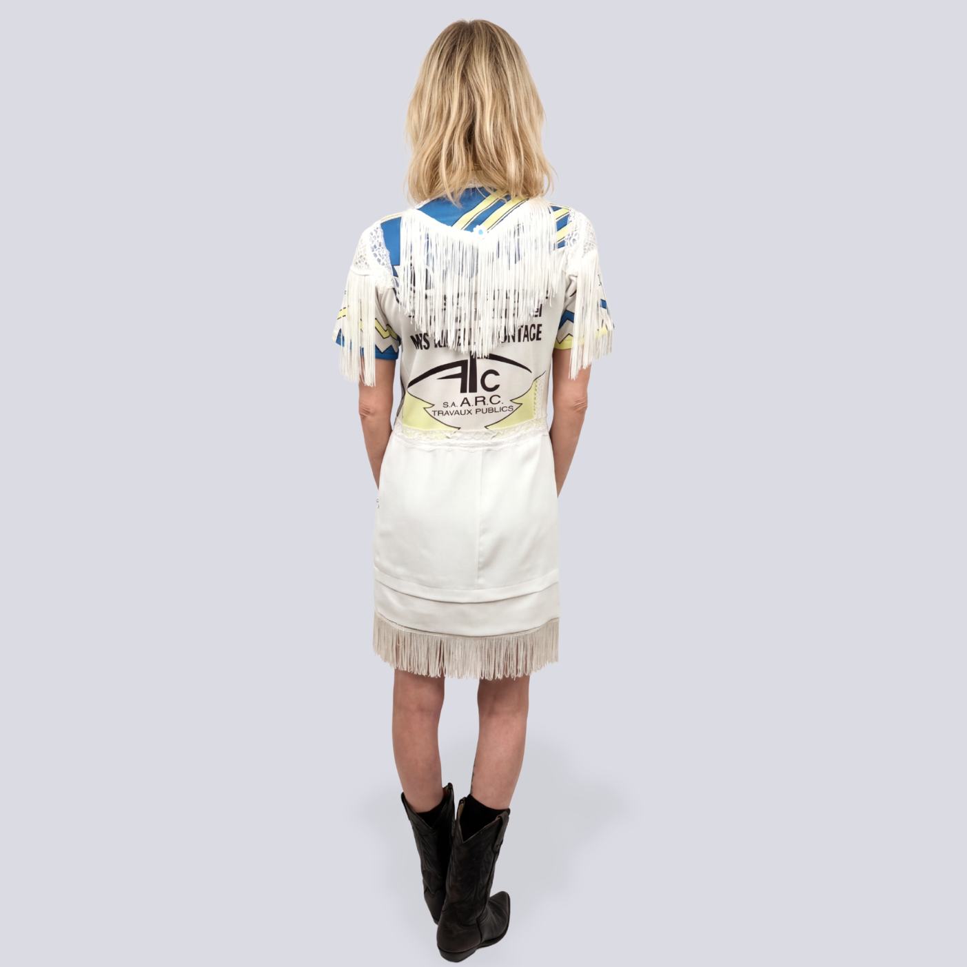 Robe cycliste western avec fleurs brodées, franges, diverses dentelles et épaulettes incrustées.