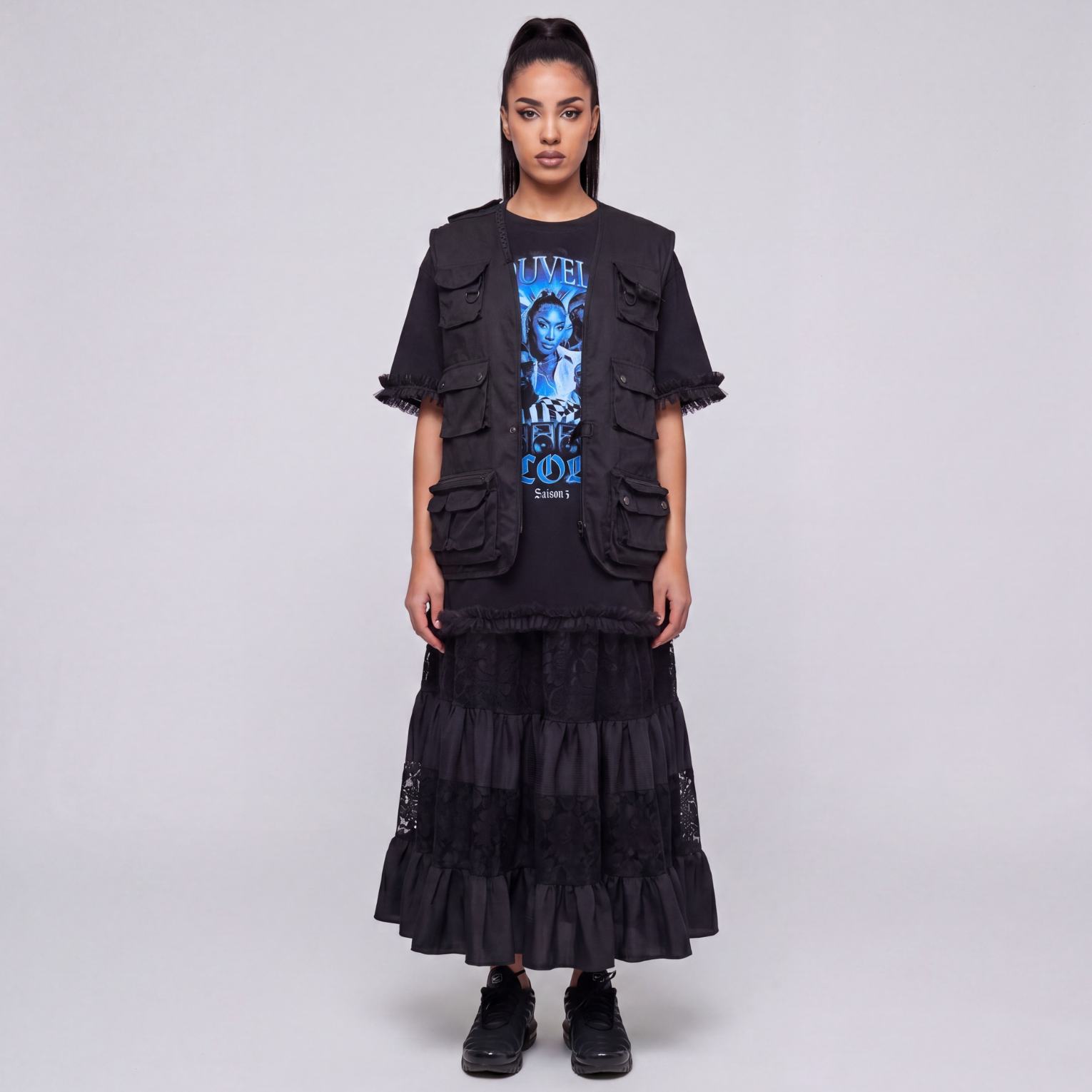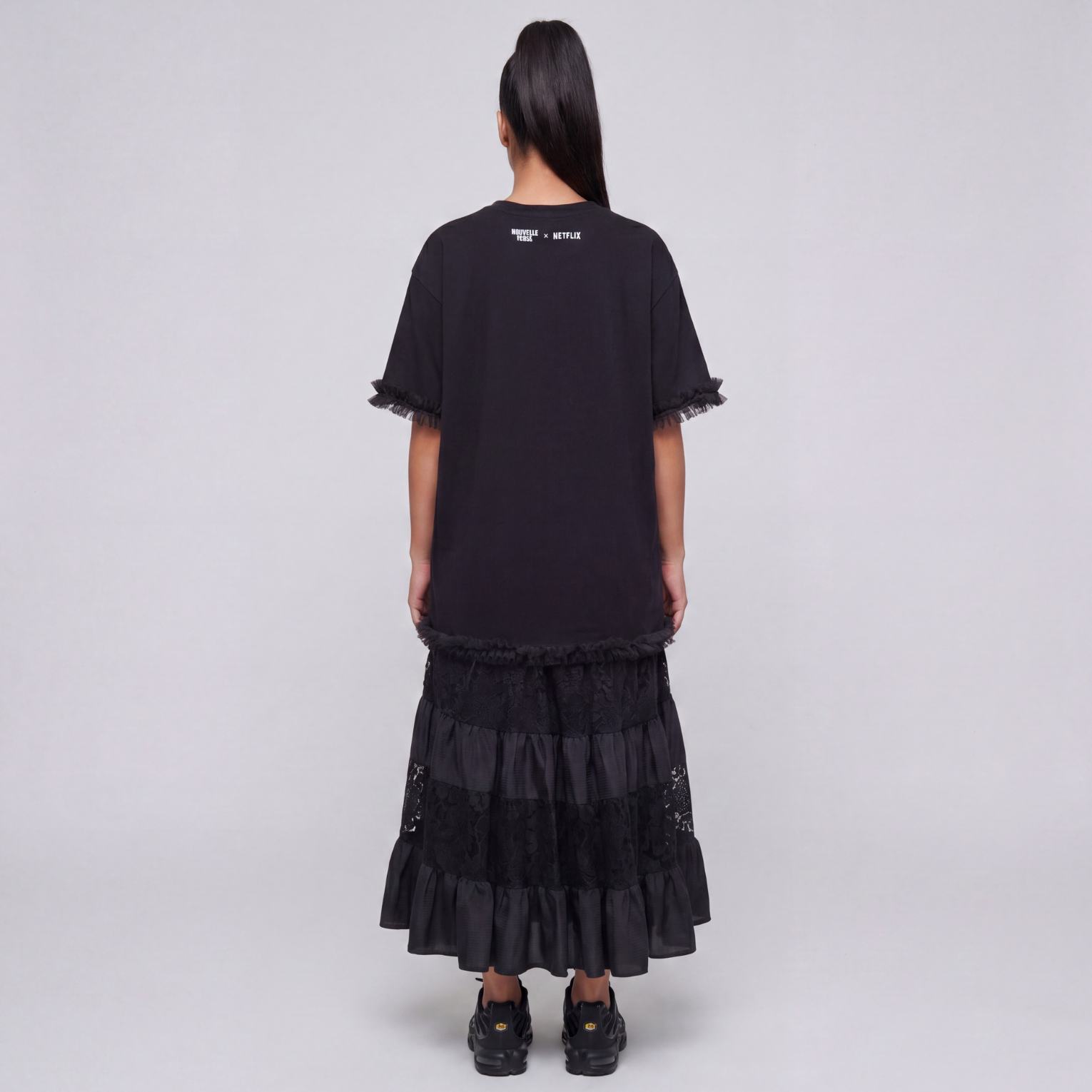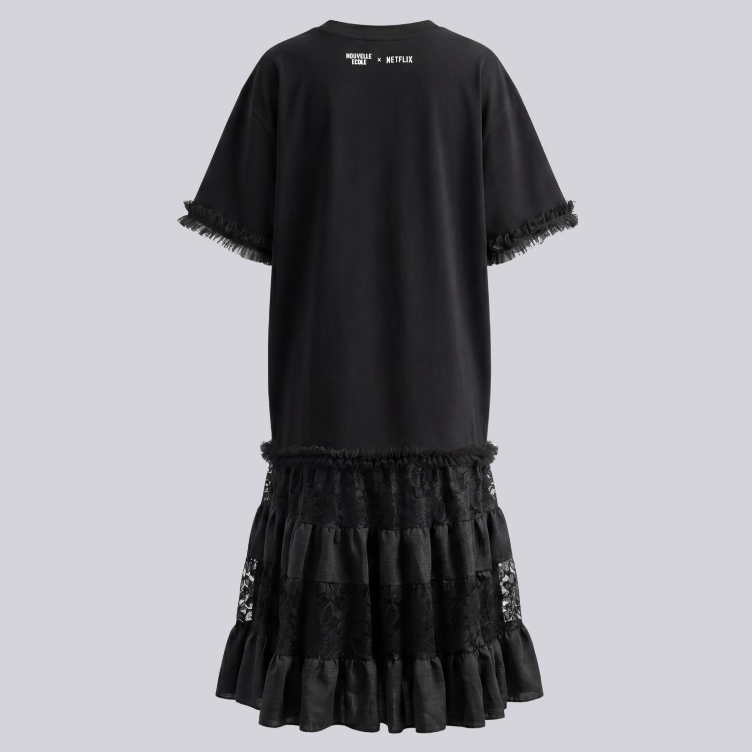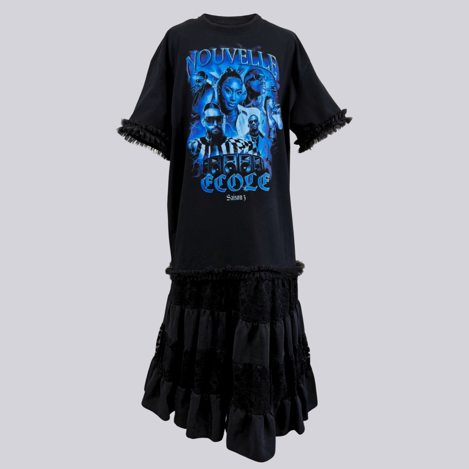 Robe “Nouvelle école” saison 3 asymétrique upcyclée. La jupe est déstructurée (plus courte à droite). Cette pièce oversize est agrémentée de dentelle noire et de tulle.